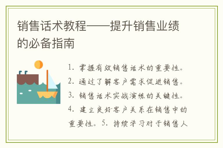 随着市场竞争的日益激烈,销售话术在销售过程中的作用愈发重要。掌握有效的销售话术,不仅能提升销售业绩,还能建立良好的客户关系。本教程将为你揭示销售话术的奥秘,帮助你成为一名顶尖的销售人员。