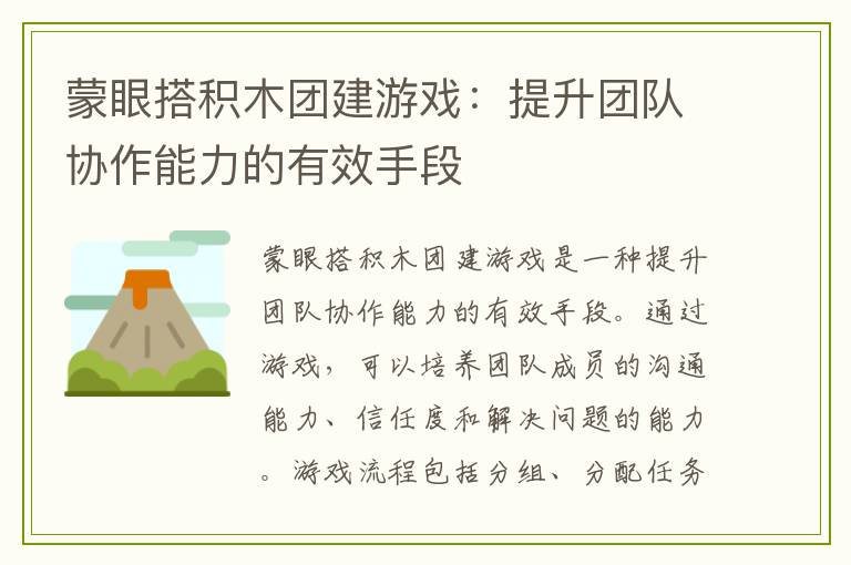 蒙眼搭积木团建游戏是一种结合了团队协作与心理素质挑战的趣味游戏。参与者需要在蒙眼的状态下,依靠团队成员之间的沟通与协作,完成搭积木的任务。游戏旨在提升团队成员间的默契度和协作能力,同时培养沟通、信任和解决问题的能力。二、游戏流程