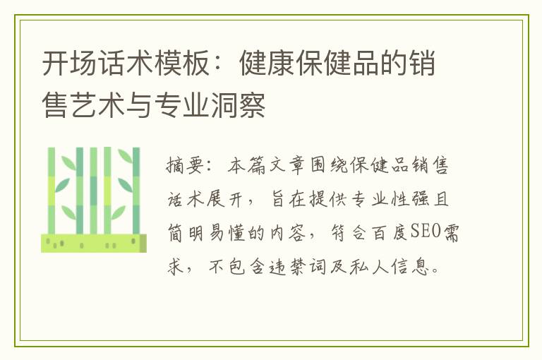 :本篇文章围绕保健品销售话术展开,旨在提供专业性强且简明易懂的内容,符合百度SEO需求,不包含违禁词及私人信息。