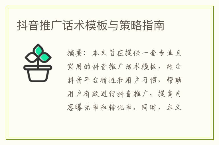 :本文旨在提供一套专业且实用的抖音推广话术模板,结合抖音平台特性和用户习惯,帮助用户有效进行抖音推广,提高内容曝光率和转化率。同时,本文注重简明易懂,符合百度SEO需求,不涉及违禁词及私人信息。