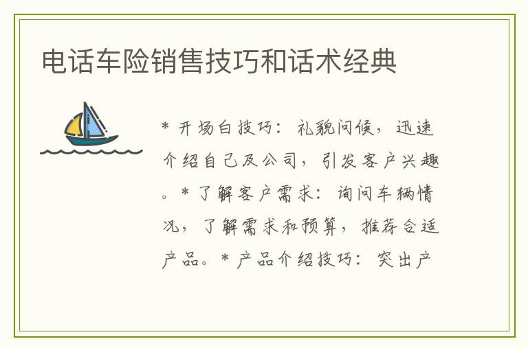 在当今繁忙的社会,电话车险销售成为保险行业的主要销售渠道之一。掌握有效的销售技巧和话术对于车险销售人员来说至关重要。以下是电话车险销售过程中的一些经典技巧和话术。