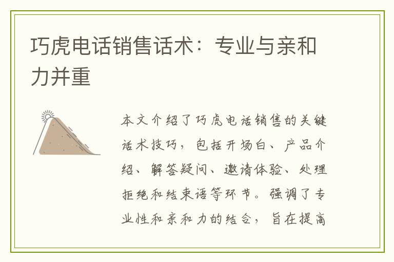 电话铃声响起,专业的销售话术就此展开。销售人员应热情并礼貌地向客户问好,简要介绍自己和公司背景。例如:“您好,我是巧虎公司的电话销售员,致力于提供优质的客户体验。请问您现在有时间听我介绍一下我们的产品吗?”