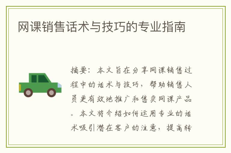 :本文旨在分享网课销售过程中的话术与技巧,帮助销售人员更有效地推广和售卖网课产品。本文将介绍如何运用专业的话术吸引潜在客户的注意,提高转化率,并遵循百度SEO需求,提升内容可见性。