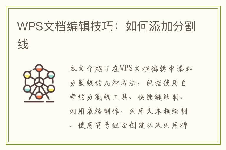 1. 打开WPS文档,将光标移动到你需要插入分割线的位置。 2. 在菜单栏中选择“插入”,在下拉菜单中找到“形状”选项。 3. 在“形状”选项中选择线条,拖动鼠标绘制出你需要的分割线。