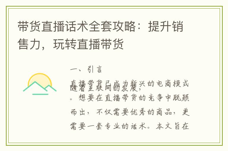 随着互联网的发展,直播带货已成为新兴的电商模式。想要在直播带货的竞争中脱颖而出,不仅需要优秀的商品,更需要一套专业的话术。本文旨在为广大带货主播提供一套完整的带货直播话术攻略。