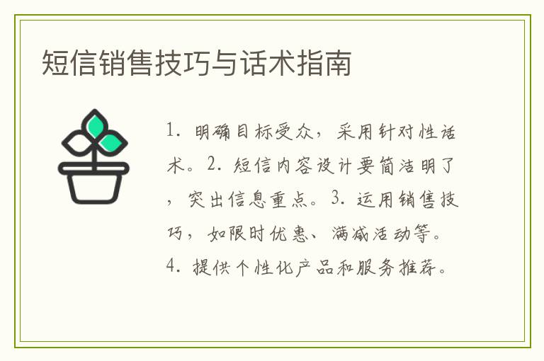 随着科技的发展,短信销售已成为日常营销活动中不可或缺的一环。如何巧妙运用销售技巧和话术,提升短信销售效果,是每位销售人员需要掌握的技能。二、明确目标受众