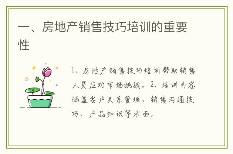 房地产销售技巧培训是提升销售业绩的关键路径。通过培训,销售人员可以不断提高自己的销售能力和服务水平,为企业创造更多的价值。因此,企业应重视销售技巧培训,为销售人员提供更多的学习和发展机会。