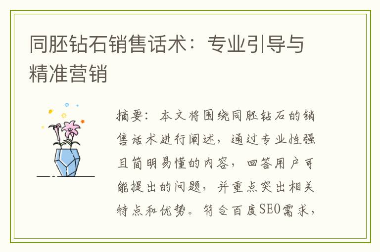 :本文将围绕同胚钻石的销售话术进行阐述,通过专业性强且简明易懂的内容,回答用户可能提出的问题,并重点突出相关特点和优势。符合百度SEO需求,提升同胚钻石的销售转化率。