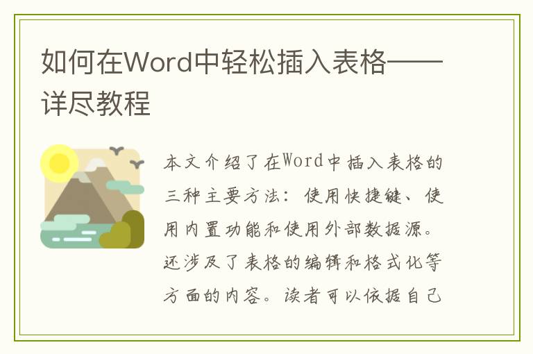 在Word文档中,插入表格是一个常见的需求,尤其在处理数据、展示报告或制作简历时。掌握如何在Word中插入表格,不仅可以提高工作效率,还能使文档更加专业。本文将详细介绍如何在Word中插入表格,包括使用快捷键和内置功能等方法。二、使用快捷键插入表格