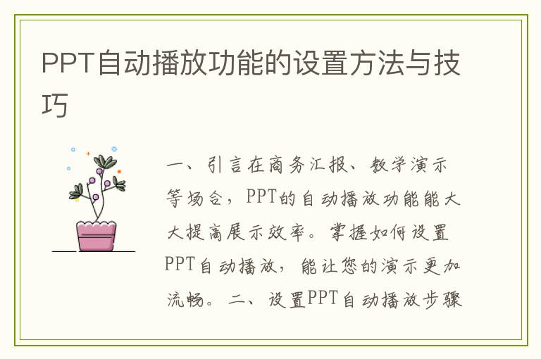 通过掌握PPT的自动播放功能及相关技巧,您能够轻松实现流畅的演示效果。结合实际应用场景,灵活运用此功能将为您的商务汇报或教学演示增色不少。 ml-citation{" ref="文章中涉及到的引用内容或者权威数据来源"}" data="citationList" 三、内容摘录 * 介绍了PPT自动播放功能的设置步骤 * 提到了在商务汇报、教学演示等场合的应用 * 强调了设置过程中的注意事项,如嵌入视频音频的同步问题 * 提供了常见问题的解答 * 总结部分强调了掌握PPT自动播放功能的重要性及其在实际应用中的价值。 四、关键词 PPT自动播放功能、设置步骤、商务汇报、教学演示、应用技巧、常见问题解答。