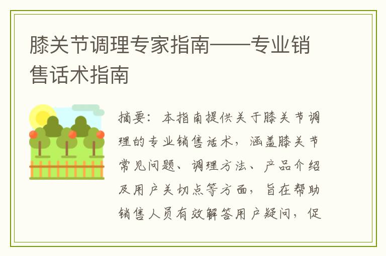 :本指南提供关于膝关节调理的专业销售话术,涵盖膝关节常见问题、调理方法、产品介绍及用户关切点等方面,旨在帮助销售人员有效解答用户疑问,促进膝关节调理产品的销售。