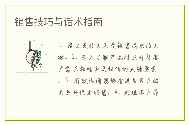 在现代商业环境中,掌握销售技巧和话术是每一位销售人员的必备能力。以下是一些专业性强且简明易懂的销售技巧和话术要点。