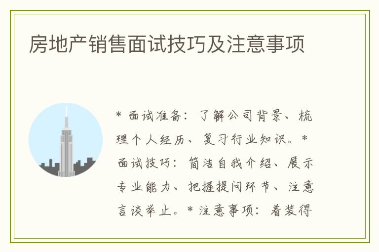 在面试房地产销售岗位时,掌握一定的面试技巧及注意事项对于成功获得职位至关重要。下面将针对房地产销售面试中的一些关键点和技巧进行详细解析。