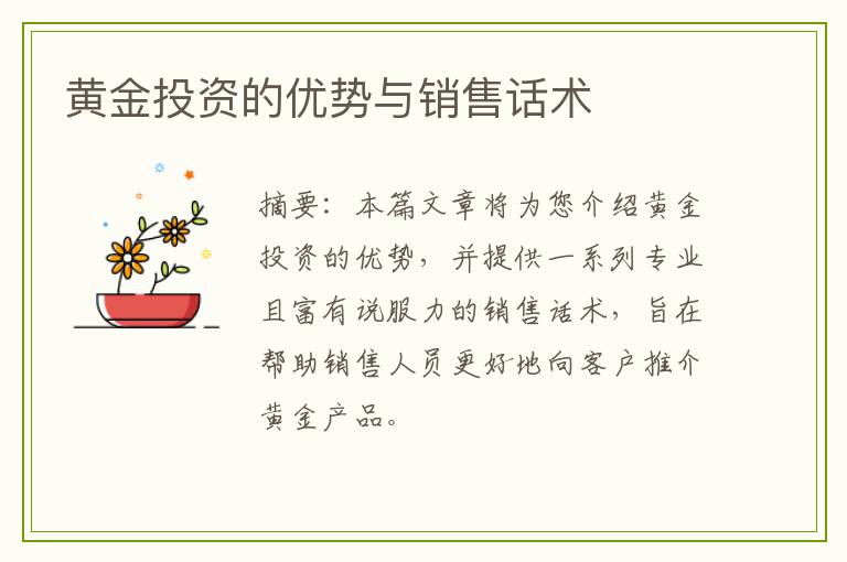:本篇文章将为您介绍黄金投资的优势,并提供一系列专业且富有说服力的销售话术,旨在帮助销售人员更好地向客户推介黄金产品。