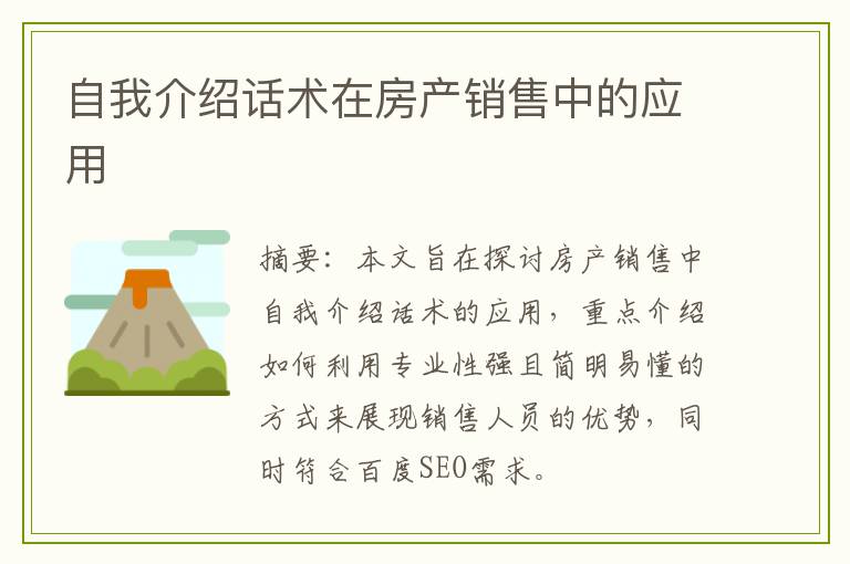 :本文旨在探讨房产销售中自我介绍话术的应用,重点介绍如何利用专业性强且简明易懂的方式来展现销售人员的优势,同时符合百度SEO需求。