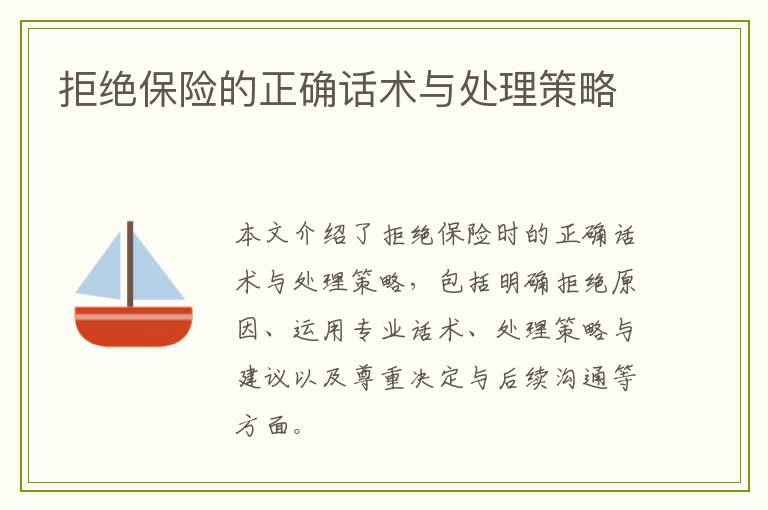 在拒绝保险的过程中,除了话术外,还需要合适的处理策略。以下是一些建议:一是保持耐心和礼貌,避免冲突;二是提供充分的理由和依据,支持自己的观点;三是保持开放的态度,对对方的意见持尊重态度;四是提出建设性的解决方案,帮助对方理解你的立场和需求。