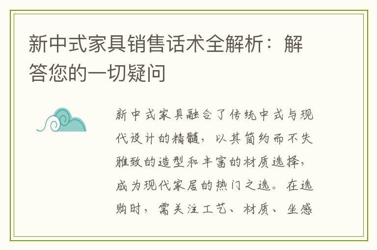 在追求生活品质与家居美学的今天,新中式家具以其独特的韵味和实用性,成为了越来越多家庭装修时的首选。然而,面对琳琅满目的新中式家具产品,您是否曾有过诸多疑问?本文将通过一系列可能的问题与回答,为您深入解析新中式家具的魅力所在,帮助您做出更加明智的选择。