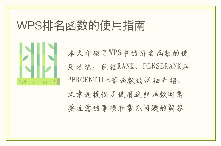 WPS中的排名函数主要用于对数据进行分析和排序。根据数据的不同特点和需求,WPS提供了多种排名函数,如RANK、DENSERANK和PERCENTILE等。这些函数可以帮助用户快速得出数据的排名情况,为决策提供支持。三、RANK函数的使用