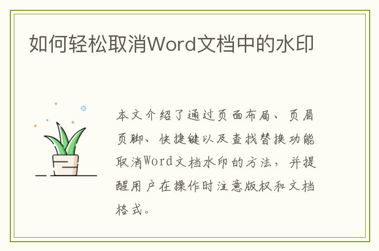 在取消Word文档水印时,请确保您拥有文档的合法操作权限,避免侵犯他人版权。同时,在修改文档时,请注意文档的格式和排版,以免在去除水印过程中破坏文档内容。